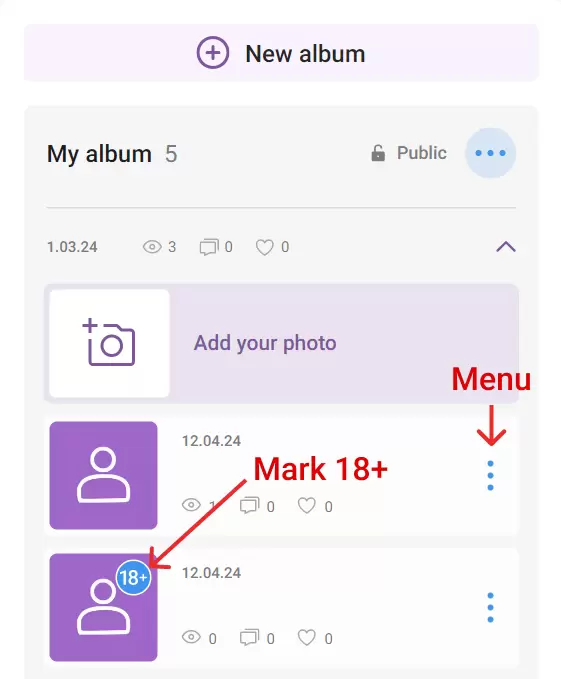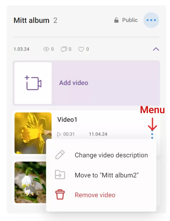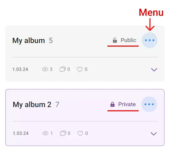 To perform one of the actions on an album, click on the menu icon (three dots) in the right corner of the album and select the desired action.
