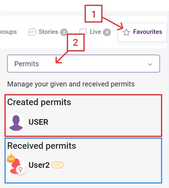 Click on "Favorites" in your account. From the items, select "Permits". You will see all given and received permits.